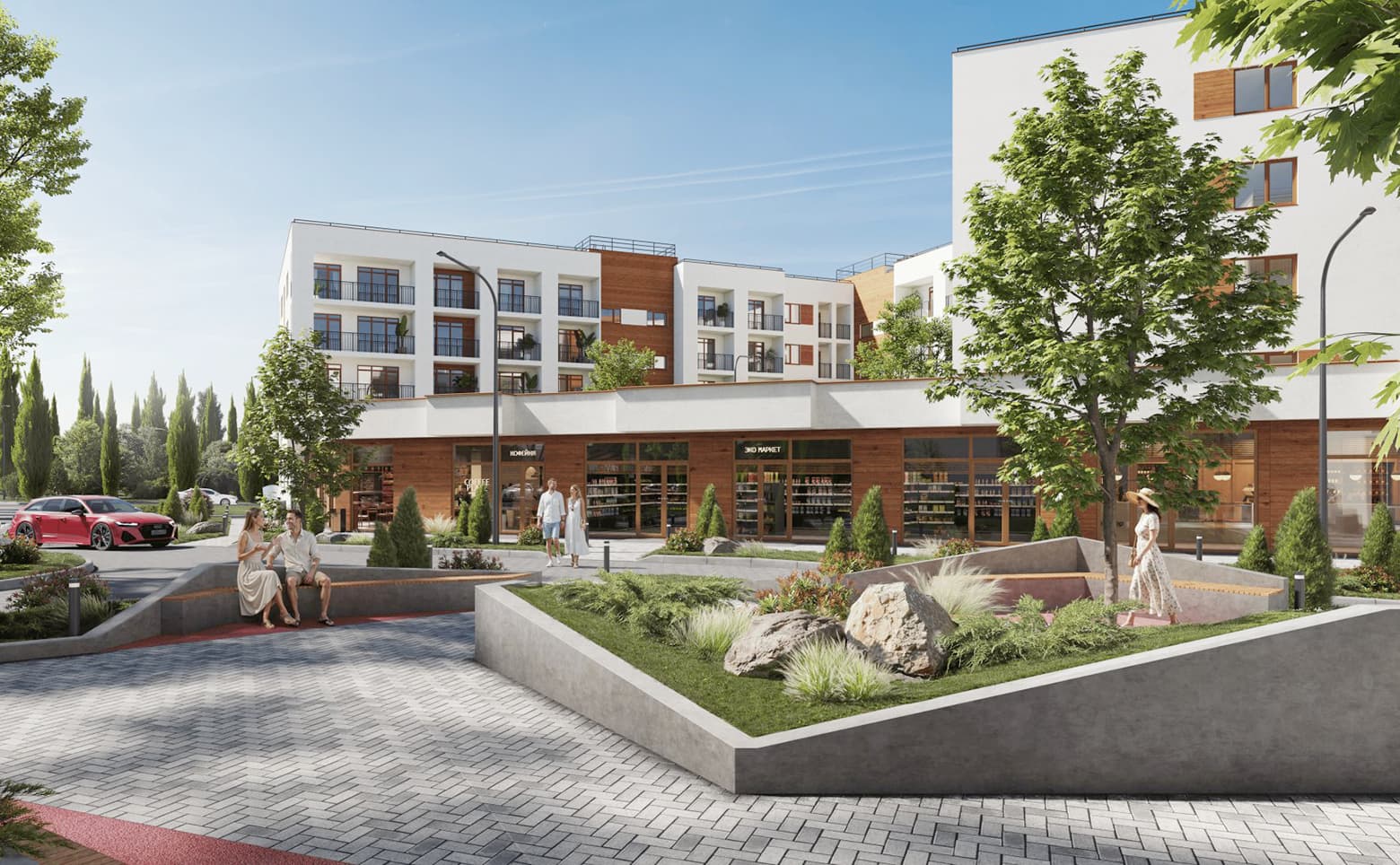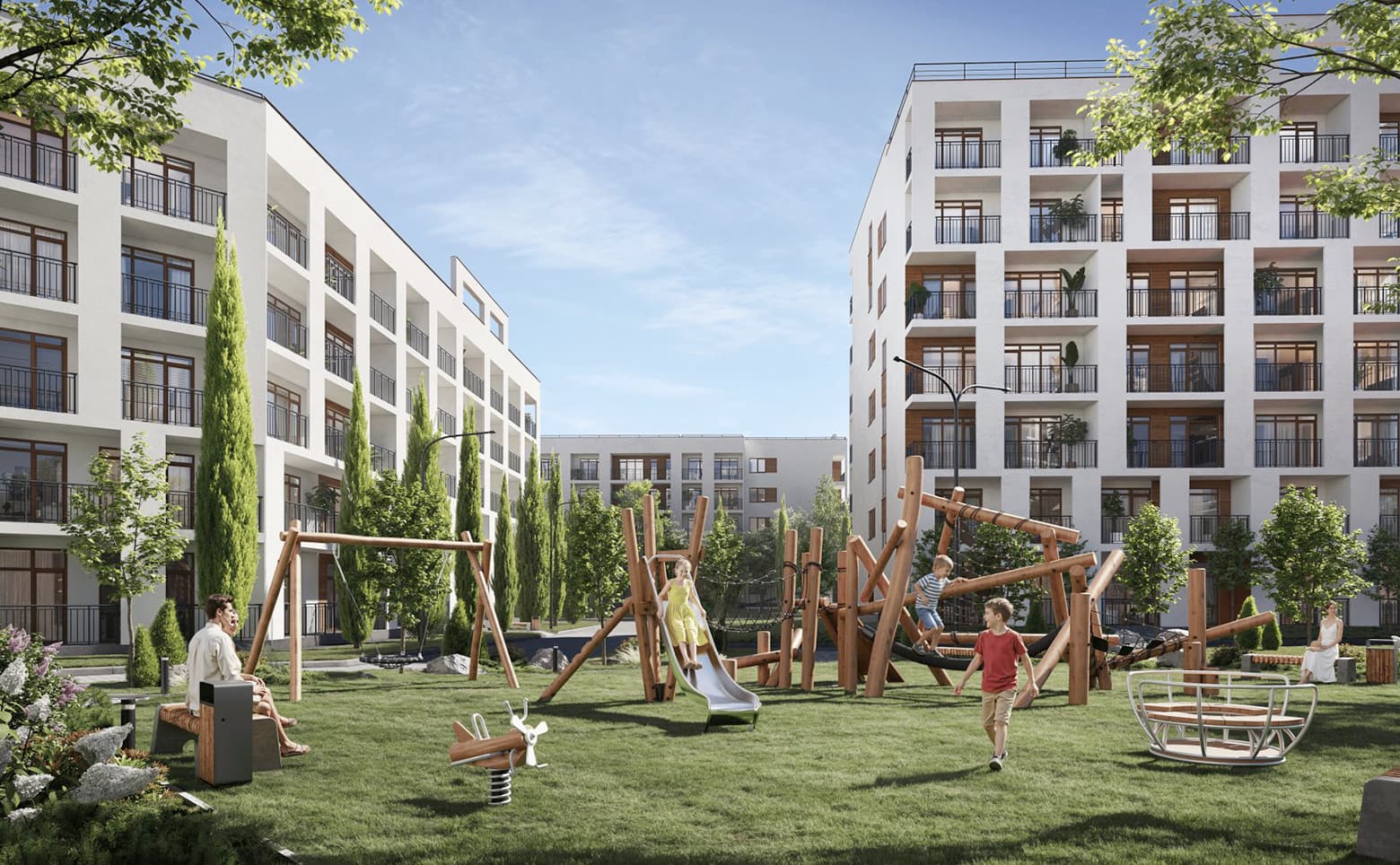 Апарт-комплекс комфорт-класса расположен на территории площадью 17 га. В первом этапе застройки представлено 3 корпуса переменной этажности от 5 до 9 этажей. Здания возведены по кирпично-монолитной технологии, фасады облицованы штукатуркой. В корпусах установлены бесшумные пассажирские и грузовые лифты. Входные группы оформлены дизайнерскими холлами. Пространство организовано по принципу безбарьерной среды.