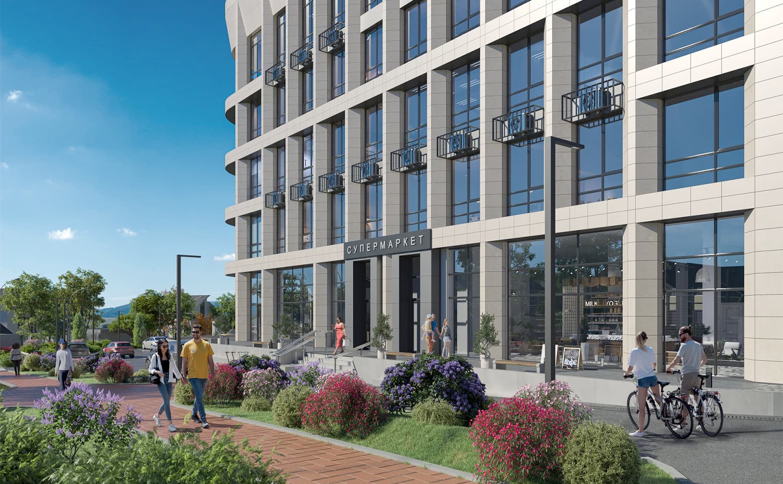 На территории организован удобный открытый паркинг, пространство благоустроено с элементами ландшафтного озеленения. На первом этаже размещены торговые залы, доступна установка вывески в соответствии с бренд-буком. Обустроен подъезд для погрузки и выгрузки. На последнем этаже находятся тренажерный зал и спортивная школа единоборств.