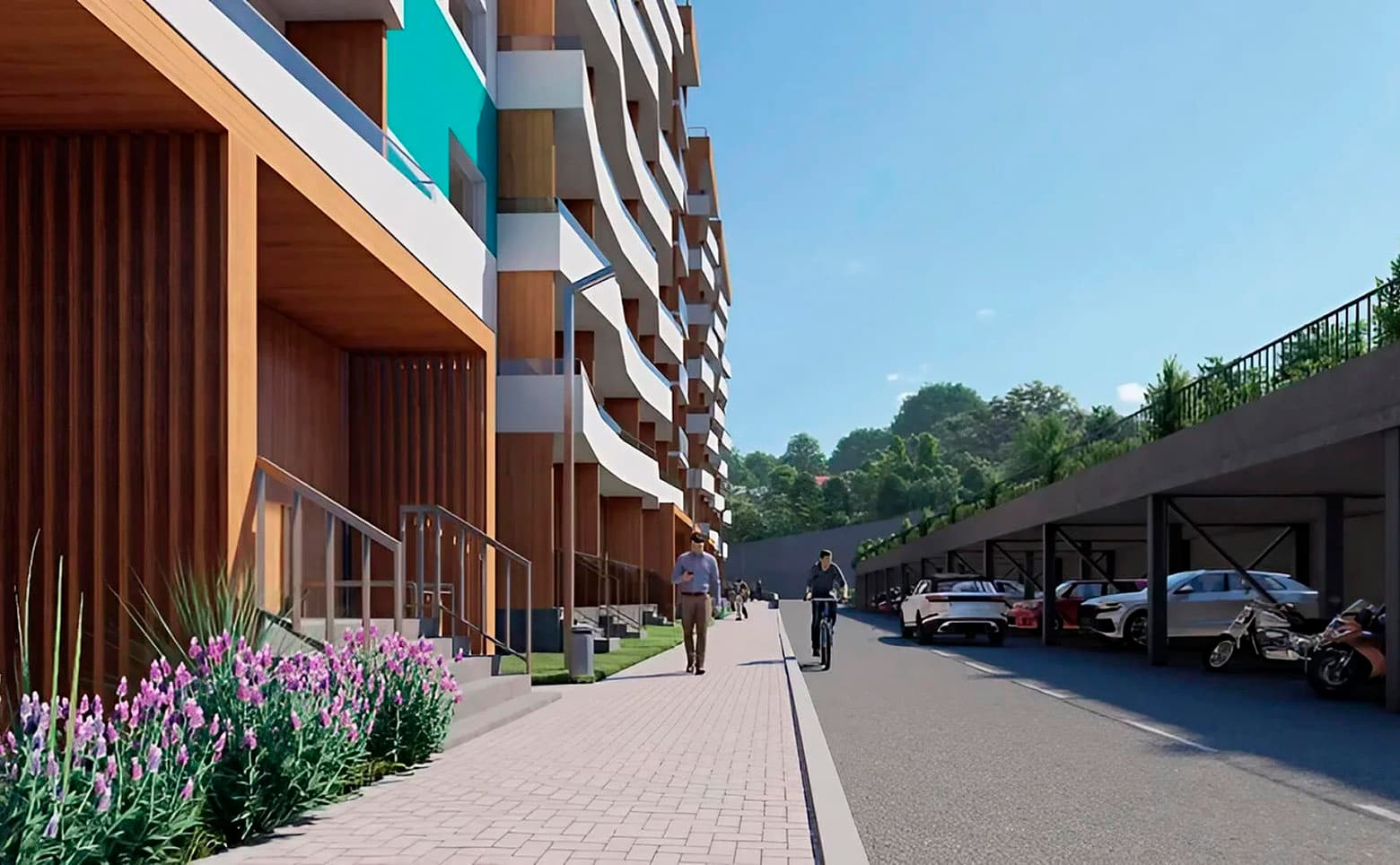 Апартаментный комплекс представляет собой монолитное здание высотой 8 этажей с фасадами, оформленными декоративной штукатуркой. Входные группы дополнены лифтовыми холлами с мягкими зонами ожидания. Проект выполнен с акцентом на удобство — в здании предусмотрены пассажирский и грузовой лифты, а архитектура сочетает функциональность и лаконичность.