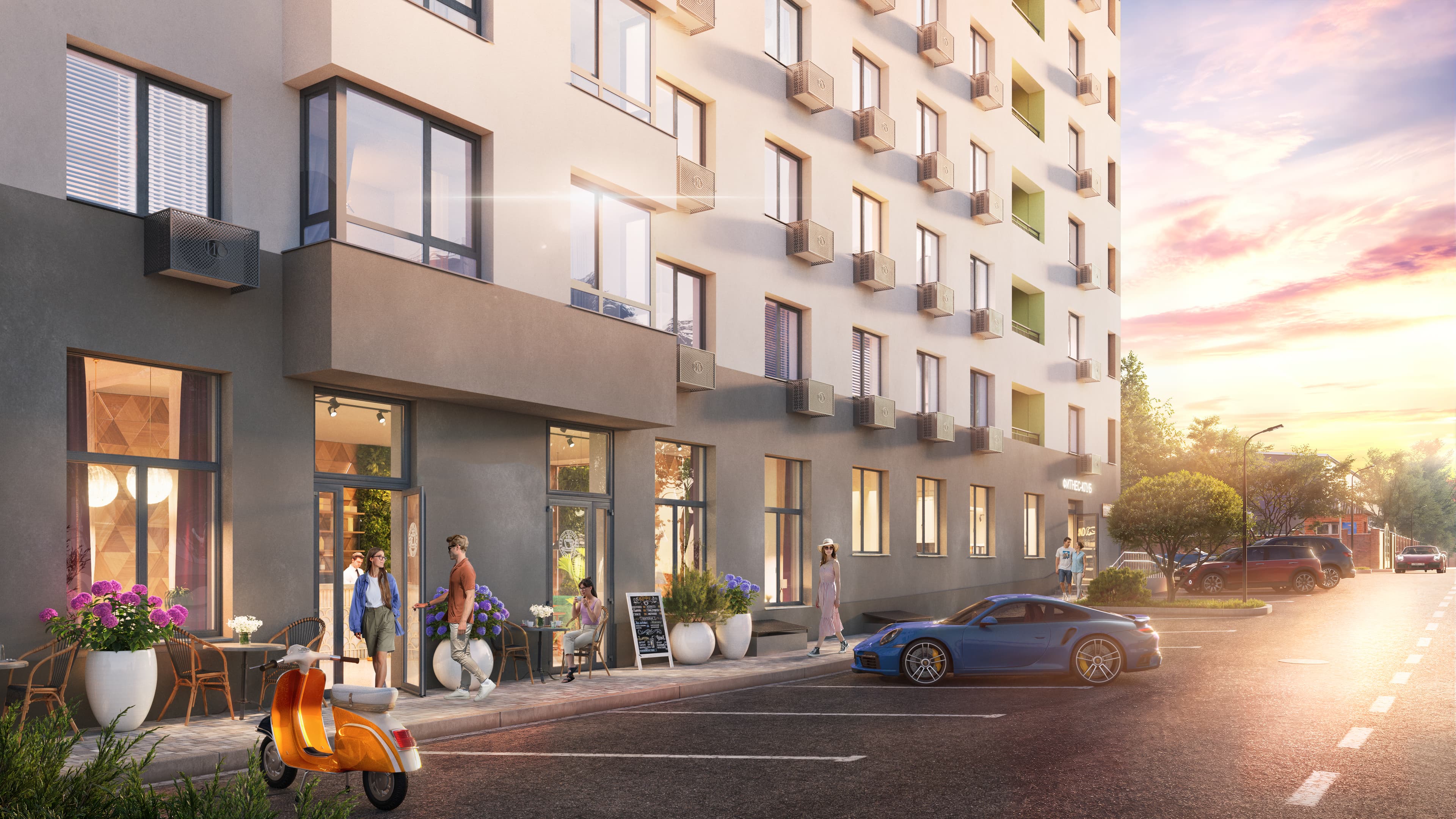 Территория комплекса благоустроена: выполнено ландшафтное озеленение с автополивом, обустроены прогулочные дорожки, зоны отдыха, детские и спортивные площадки. Для хранения предусмотрены кладовые, организована открытая стоянка рядом с домом. На нижних этажах запроектированы коммерческие помещения под кофейни, магазины, аптеки и сервисы. Объект оснащен круглосуточной системой видеонаблюдения.