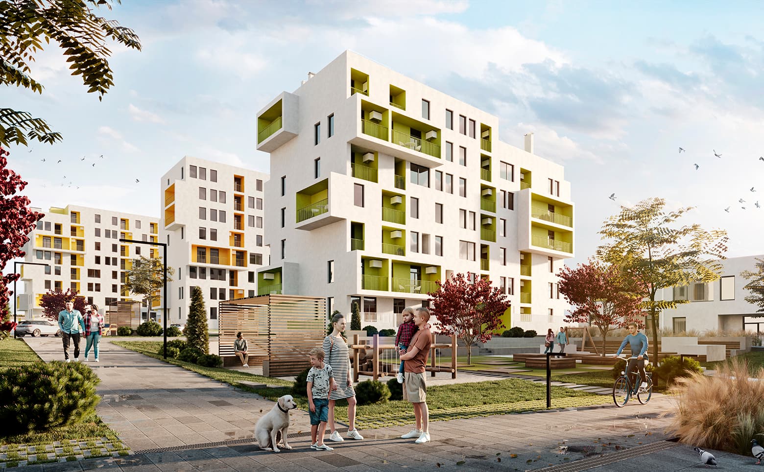 Территория комплекса организована как пространство без машин. Для хранения предусмотрены индивидуальные кладовые, колясочные и велосипедные помещения в каждом доме. Обустроены прогулочные аллеи, зоны с перголами, декоративными лавочками и тенистыми местами для отдыха. Для активного досуга оборудованы спортивные площадки, футбольное поле, крытый теннисный корт, а для детей — игровые комплексы с качелями, горками и деревянными снарядами.