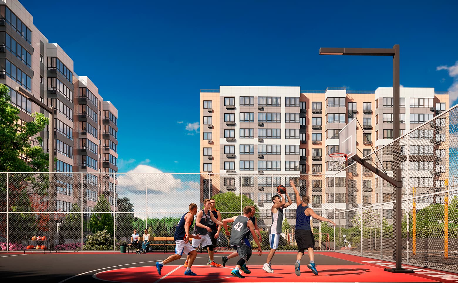 В микрорайоне предусмотрены детский сад и начальная школа, многоуровневый и подземный паркинг, а также кладовые. Двор закрыт от автомобилей, оборудованы детские и спортивные площадки, велодорожка, большая прогулочная зона с ландшафтным дизайном и редкими растениями, автоматическим поливом и газоном. Нижние этажи корпусов отведены под аптеки, медцентр, продуктовые магазины, кофейни, салоны сантехники, дизайнерских кухонь, штор, магазины для ремонта и творчества. Территория находится под видеонаблюдением.
