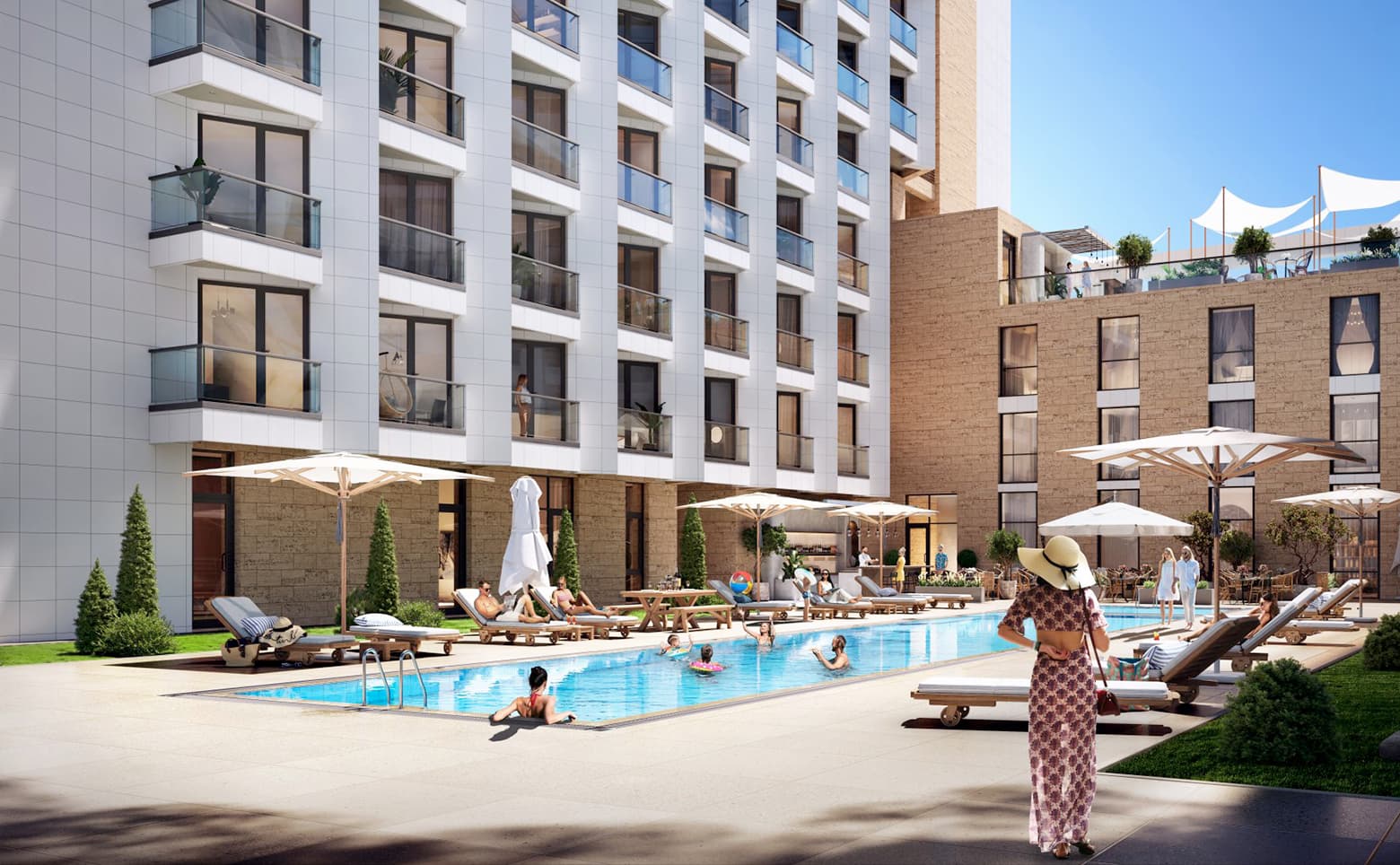 Жителям комплекса доступны собственный пляж, круглогодичный открытый бассейн с детской зоной и баром, организована стоянка для автомобилей. Работают ресторан со шведской линией и панорамное кафе. В составе инфраструктуры предусмотрены спа-центр, косметологические кабинеты, массажные комнаты, солярий, тренажерный зал и безопасные игровые пространства для детей. На территории выполнено авторское ландшафтное озеленение, предусмотрена круглосуточная охрана.
