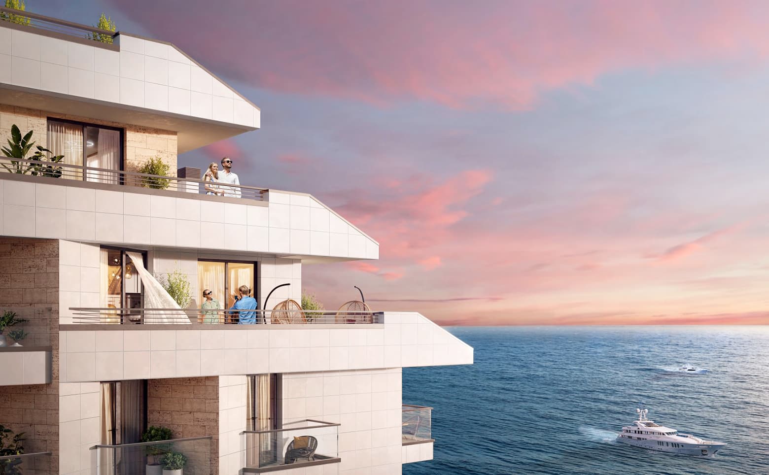 В проекте представлены студии и апартаменты с 1–3 комнатами с различными вариантами планировок. В помещениях установлены панорамные окна с видами на море. Высота потолков составляет 2,97 м. Апартаменты передаются с дизайнерским ремонтом.