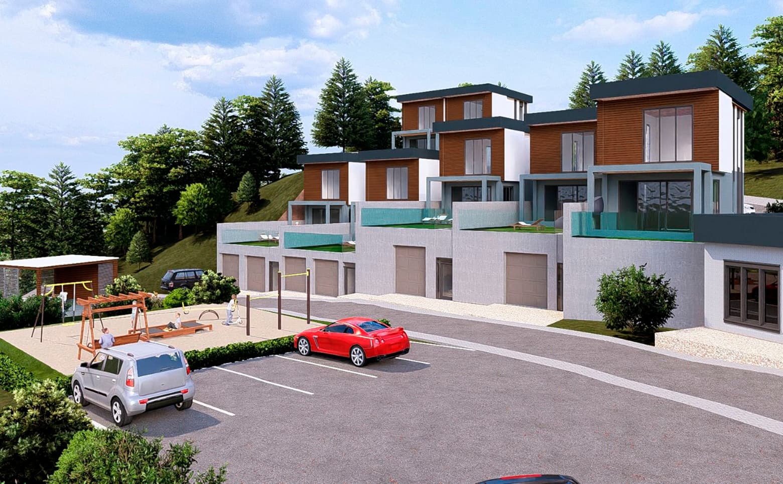 В проекте предлагаются коттеджи высотой 2 и 3 этажа. Пространства идут без отделки, установлены алюминиевые панорамные окна, потолки — 3,2 м. Из окон открываются виды на море и горы. На участке есть возможность обустроить летнюю кухню, поставить каркасный бассейн, создать зоны для отдыха с беседками и мангалом.