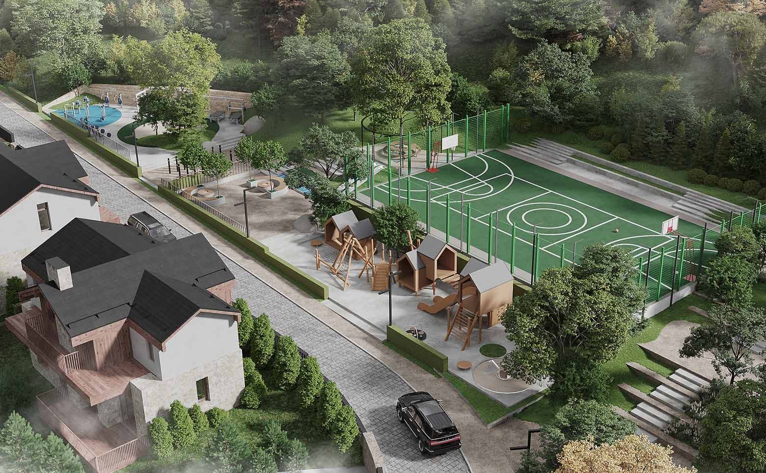 К участкам подведены необходимые коммуникации: водоснабжение от скважины, центральный газопровод, автономная канализация, электричество мощностью 15 кВт и оптоволоконный интернет. Площадь благоустройства составляет 1,76 га. На территории оборудованы спа-комплекс, бассейн с лаунж-зонами, ресторан с террасой и зоной барбекю, игровая комната и магазин. Также обустроены уличные тренажеры, места для отдыха, детские и спортивные площадки. Жителям доступен благоустроенный парк с площадками для йоги, амфитеатром, беседками и прогулочными дорожками. Территория закрытая, с КПП и круглосуточным видеонаблюдением, работает собственная управляющая компания. Для владельцев авто оборудована стоянка.