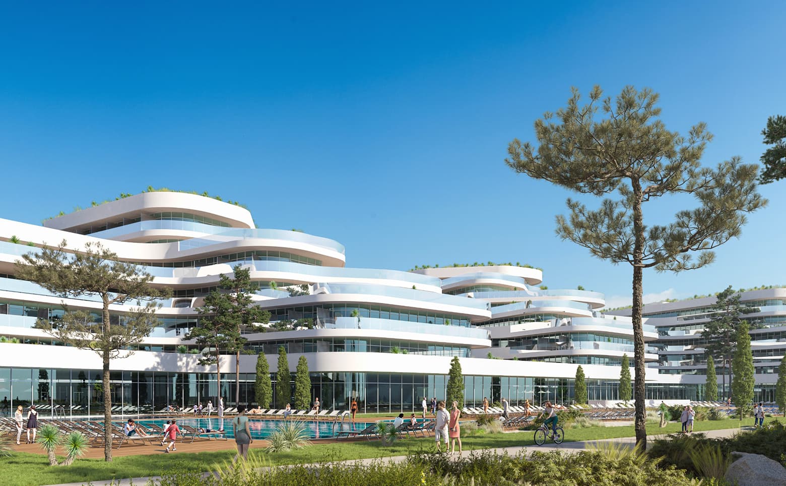 Санаторно-курортный комплекс элитного класса выполнен по монолитной технологии с комбинированными фасадами. Архитектурная композиция формирует силуэт птицы, что задает зданиям выр…