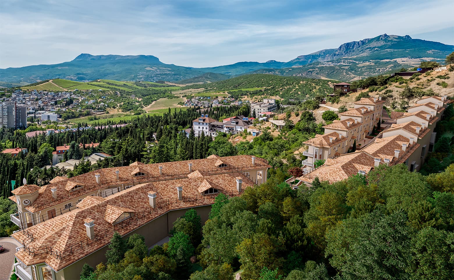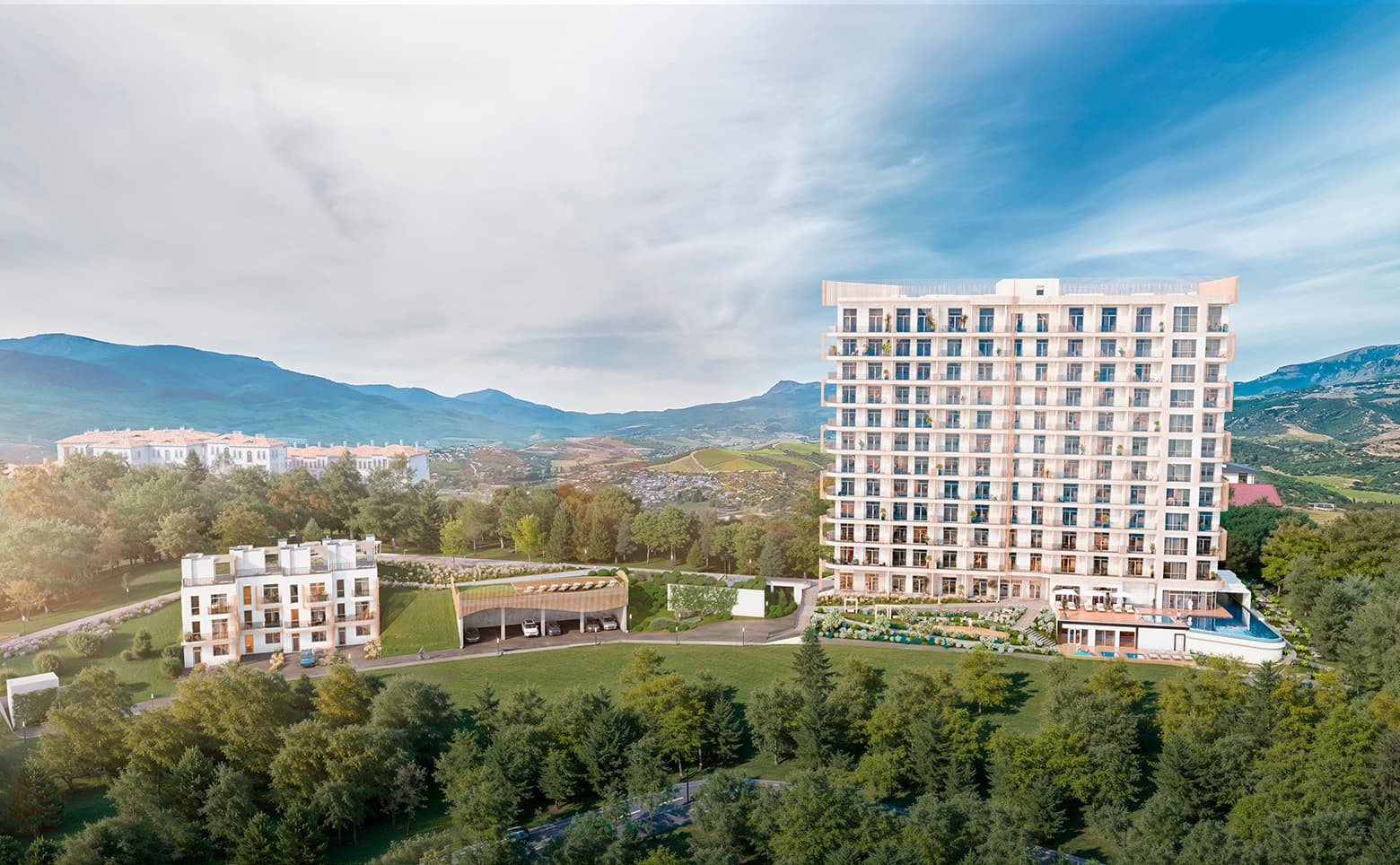 Уникальное расположение комплекса среди живописных крымских гор создает ощущение уединения и связи с природой. При этом до ближайших объектов городской инфраструктуры можно добраться за 10 минут транспортом, а путь до моря занимает около 15 минут. Неподалеку находятся магазины, кафе, остановки, аптеки и досуговые центры. Такое сочетание тишины, природы и доступности необходимых объектов инфраструктуры делает проект привлекательным как для постоянного проживания, так и для отдыха.