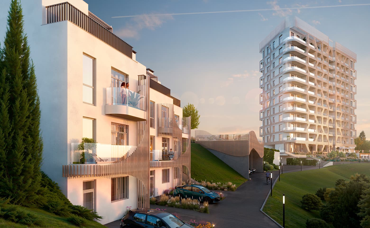 Комплекс расположен на закрытой охраняемой территории. Во внутреннем дворе — подогреваемый бассейн, кинотеатр под открытым небом, детские и спортивные площадки, зоны для отдыха. Территория свободна от автомобилей, прогулочные маршруты и инфраструктура распределены с заботой о комфорте и безопасности жителей.