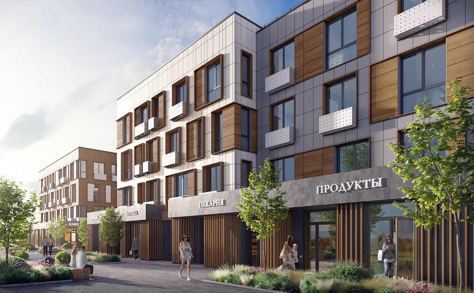 Мультиформатный жилой комплекс комфорт-класса состоит из 4-этажных кирпично-монолитных домов с вентилируемыми фасадами из керамогранита. Все здания оснащены просторными бесшумными лифтами — пассажирскими и грузовыми. Предусмотрены сквозные парадные с входом на уровне земли для удобства всех категорий жильцов.