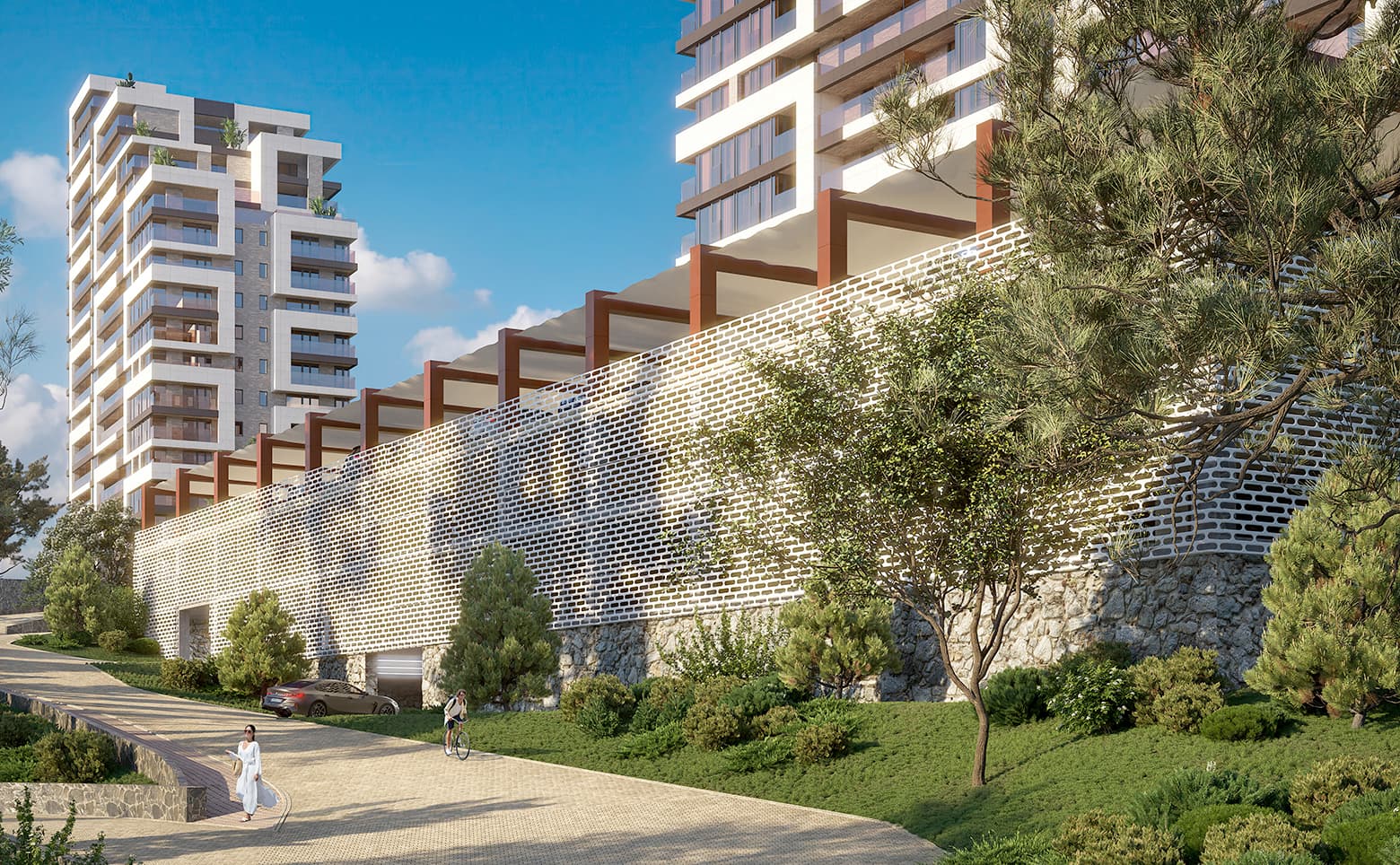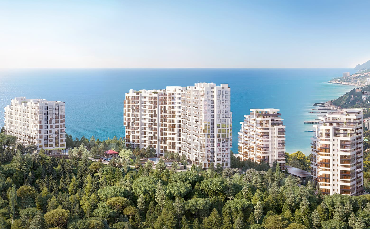 Курортный комплекс комфорт-класса расположен в окружении сосен и гор. Коллекция монолитных домов выполнена в средиземноморском стиле с фасадами светлых оттенков и витражным панорамным остеклением. В зданиях предусмотрены пассажирские и грузовые бесшумные лифты, входные группы оформлены дизайнерскими решениями. Подъезды спроектированы по принципу безбарьерной среды.