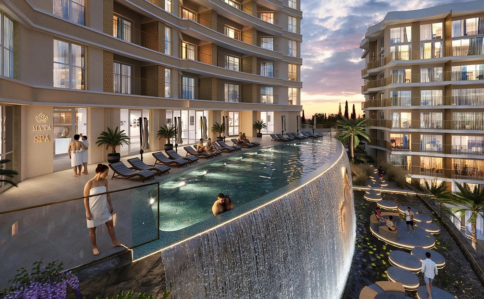 Территория комплекса благоустроена по авторскому проекту с озеленением и зонами отдыха. Для жителей обустроены 2 бассейна, в том числе круглогодичный с подогревом. Дополнительно предусмотрены спа-комплекс, фитнес-зал, спортивные площадки и ресторан, а также супермаркет и помещения для сервисных услуг. Безопасность обеспечивается системой видеонаблюдения и контролем доступа в корпуса. Для автомобилей организован подземный паркинг. За порядком следит профессиональная управляющая компания.