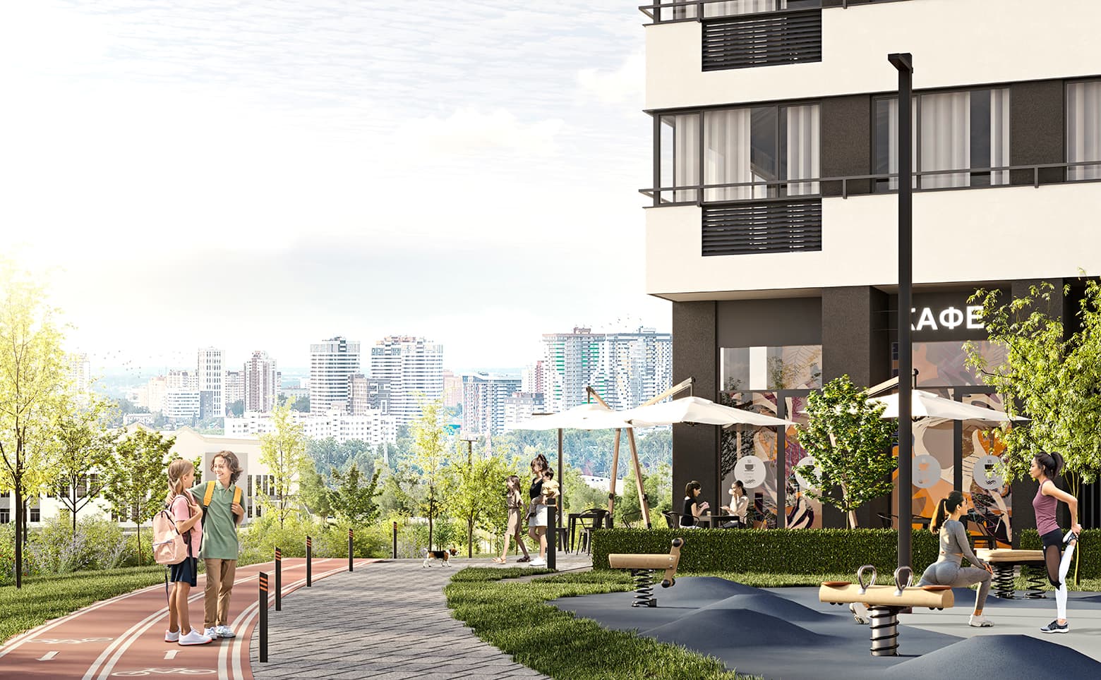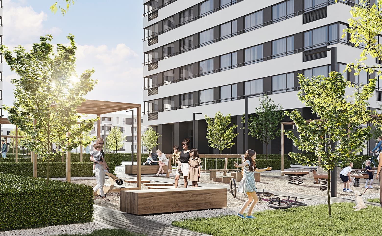 На придомовой территории комплекса обустроены спортивные площадки, зоны отдыха, миндальная аллея, беседки и места для барбекю. Для детей оборудованы игровые модули. Жители могут воспользоваться кладовыми и многоуровневым паркингом. Парковочные места также предусмотрены по периметру квартала. На нижних этажах размещены коммерческие помещения — кафе, магазины и другие объекты инфраструктуры.