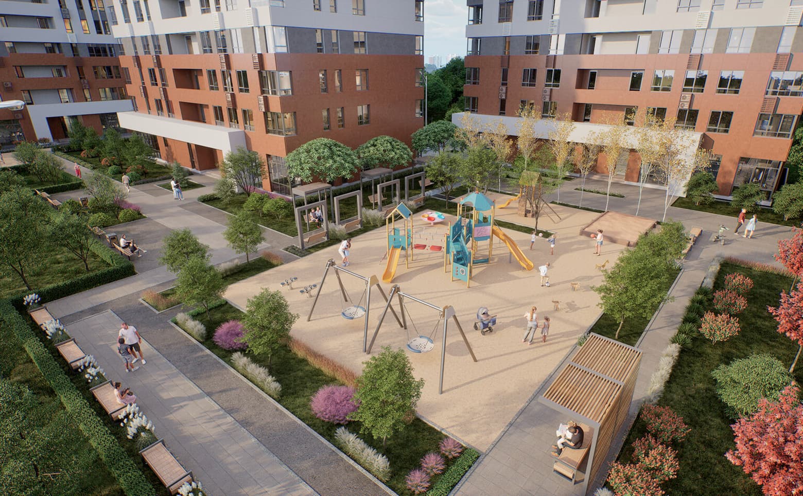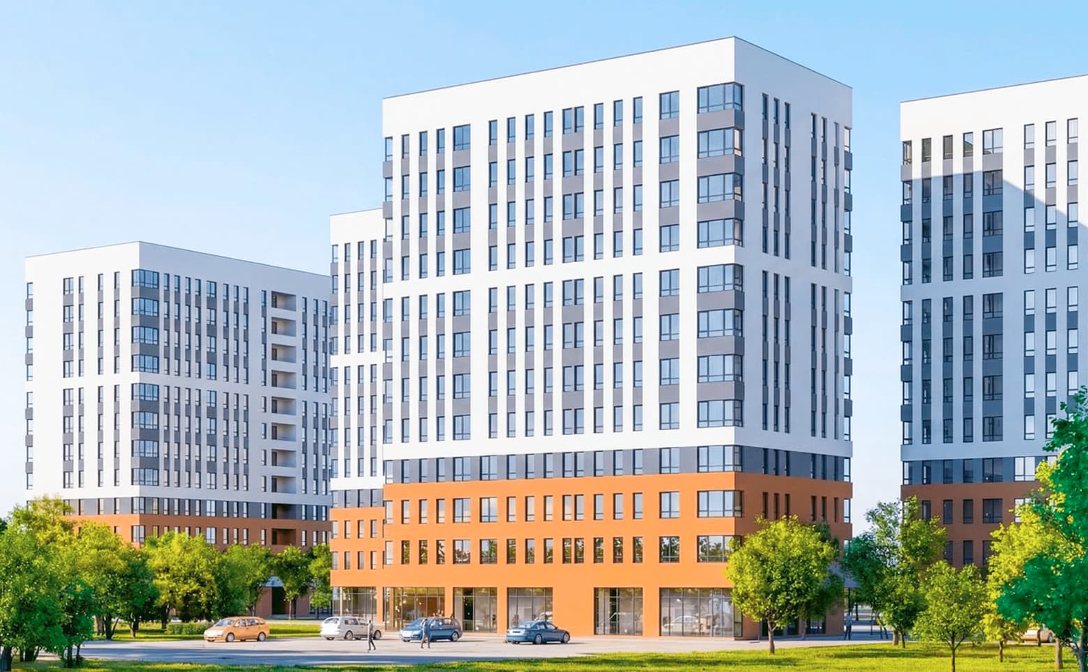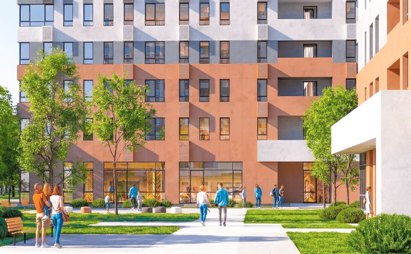 Территория комплекса благоустроена и озеленена. Для жителей оборудованы детские и спортивные площадки, прогулочные дорожки и зоны отдыха. Территория закрыта от посторонних и оснащена системой безопасности. На первых этажах корпусов размещены коммерческие помещения с отдельными входами с внешней стороны. Для владельцев автомобилей организована стоянка.