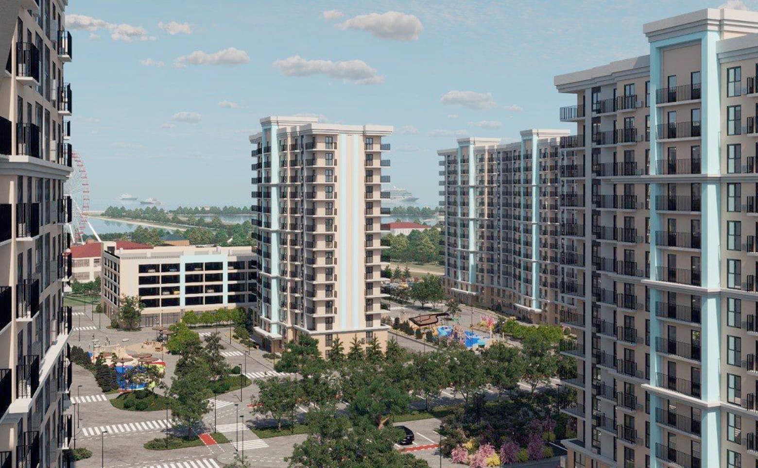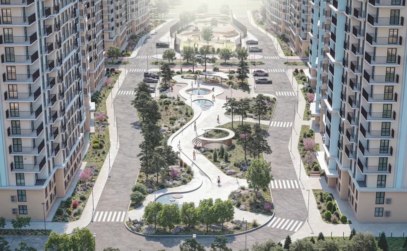 На территории предусмотрены зоны для отдыха и прогулок, аллея с фонтаном, детские игровые пространства, спортивные площадки с уличными тренажерами и многофункциональный спортивный комплекс. Жителям доступен благоустроенный песчаный пляж у озера Мойнаки. В составе комплекса запланированы торговые галереи, а также школа и детский сад. Для владельцев авто организованы многоуровневые паркинги и гостевая стоянка.
