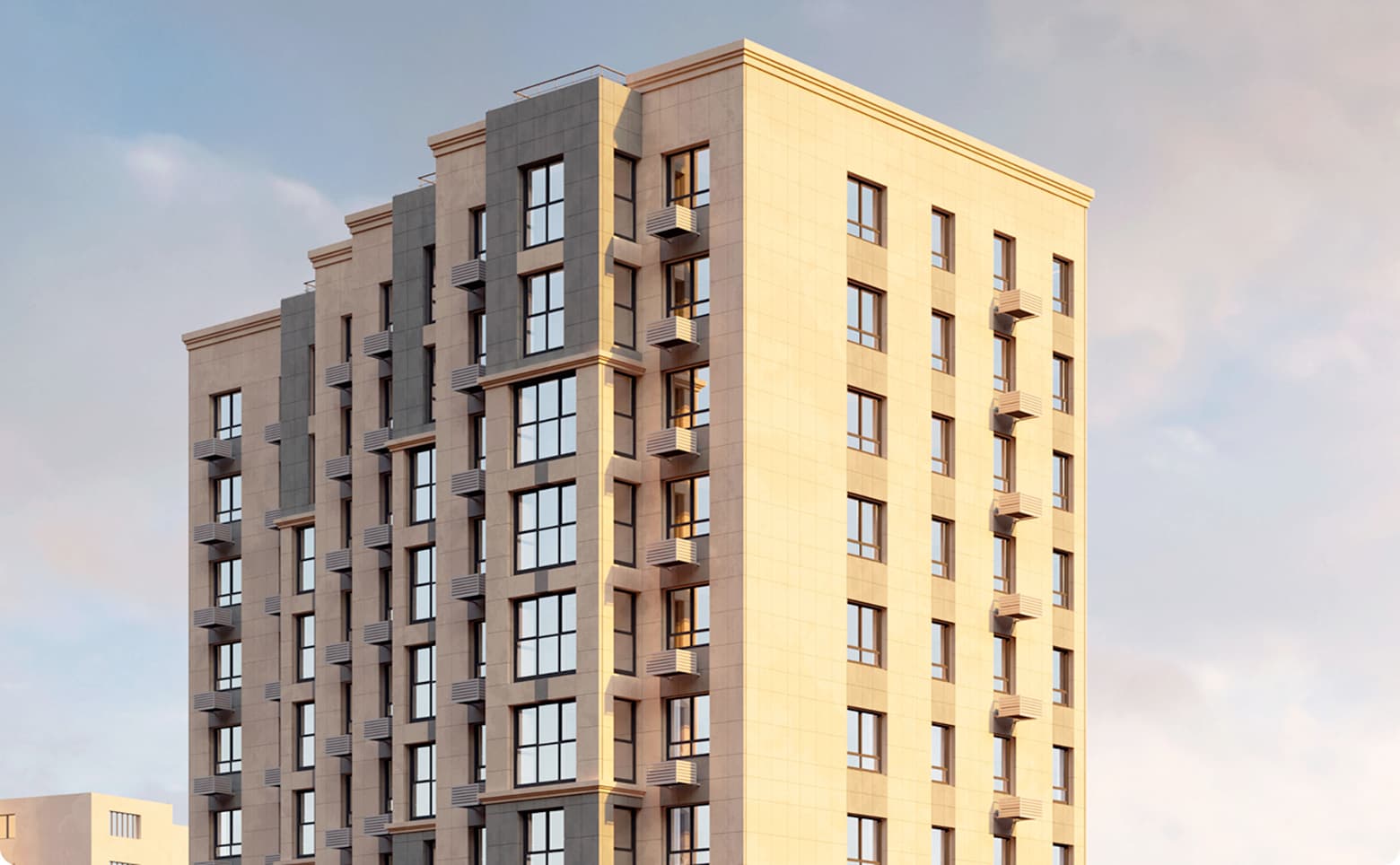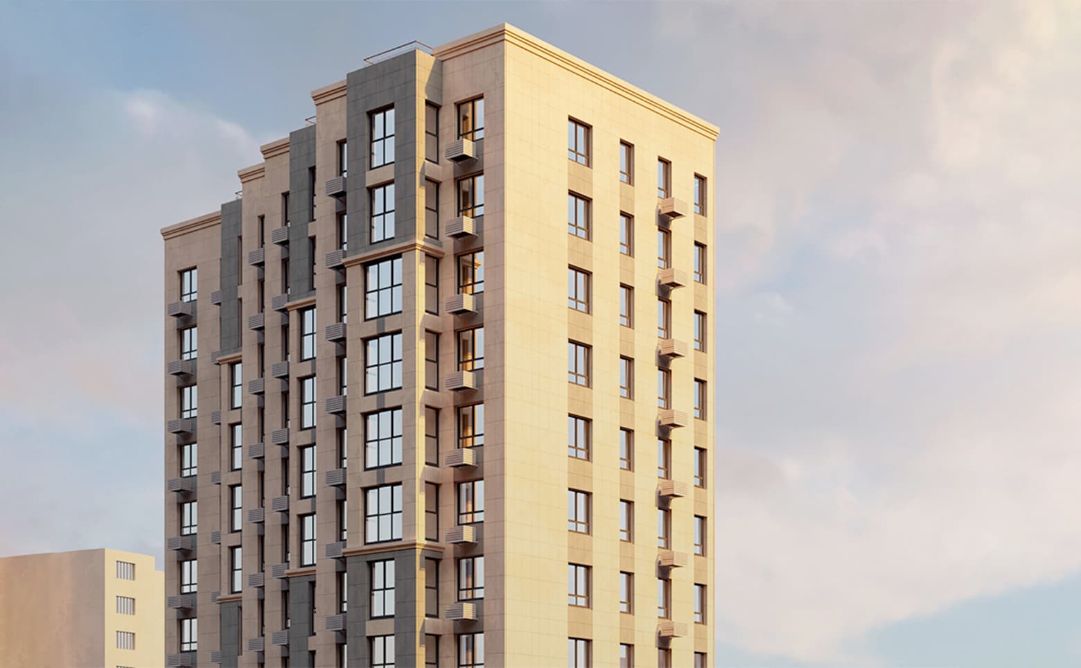 Жилой дом комфорт-класса представлен 16-этажным зданием, возведенным по монолитной технологии. Вентилируемый фасад облицован керамогранитом, что обеспечивает надежность и долговечность конструкции.