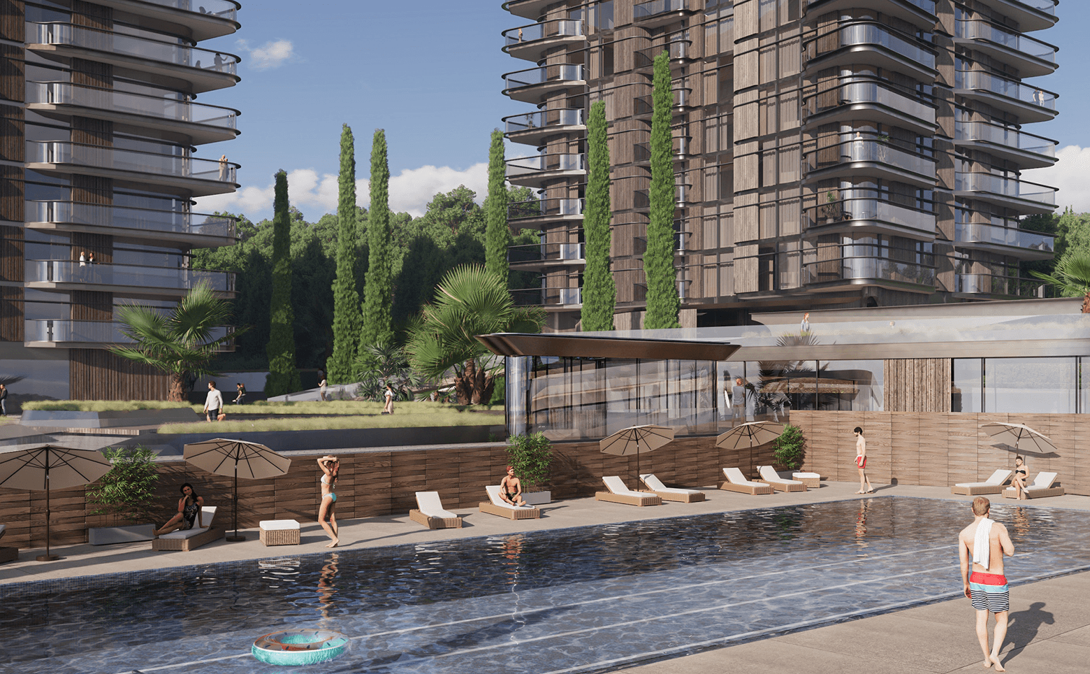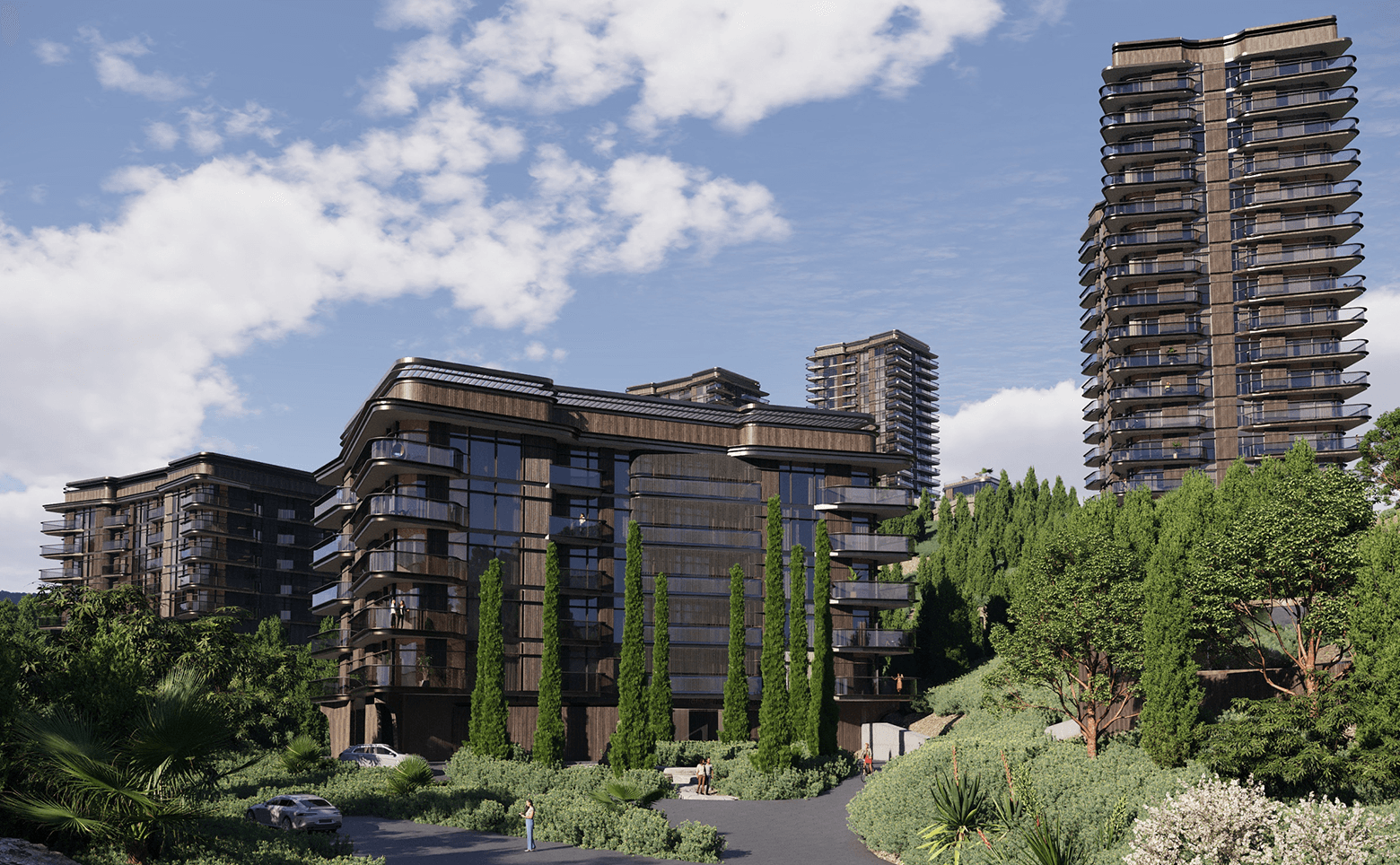 Территория комплекса закрыта и озеленена, обустроен ландшафтный парк с кипарисами, зонами отдыха с гамаками и беседками, парящими пешеходными мостами и собственной рекой Нега. Жителям доступен подогреваемый бассейн с морской водой, фитнес-центр, спа, игровые и спортивные площадки. Для владельцев авто организован подземный паркинг и станция зарядки электромобилей. Во дворе есть фруктовый сад и огород, урожай с которых используется в местном ресторане. За порядком следит профессиональная управляющая компания.