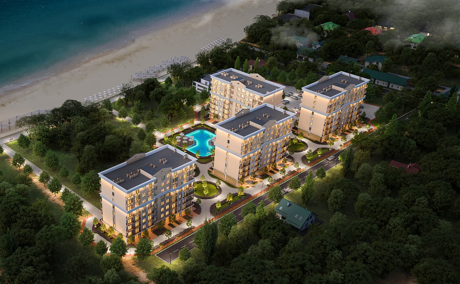 Проект расположен в поселке Заозерное, в пределах города Евпатория. Это экологически чистый район с мягким климатом, свежим воздухом и развитым курортным потенциалом. В 10 минутах пешком находится мелководная бухта с песчаными пляжами, Мойнакское озеро с лечебными ресурсами: минеральные воды, термальные источники, грязи. В пределах 20 минут транспортом расположены знаковые культурные объекты: Караимские кенасы и синагога Егия-Капай, а до аэропорта Симферополя можно добраться за 1 час.