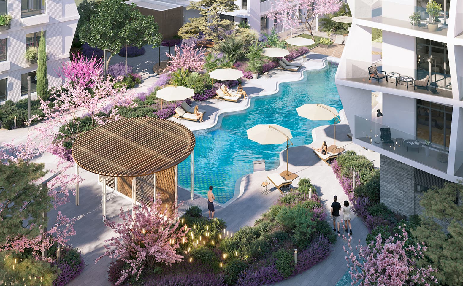 В составе комплекса предусмотрены крытые и открытые бассейны, образовательный центр для дошкольников, спортивные и детские площадки. Внутреннее пространство оформлено с использованием вертикального озеленения, обустроены аллеи для прогулок, велодорожки, ландшафтный парк, зоны для йоги, перголы и места для отдыха. Работают магазины, предприятия сферы услуг и кафе с летними верандами. На территории высажены краснокнижные многовековые деревья и растения, а в кронах обитают белки. Для автомобилей организована стоянка и подземный паркинг.