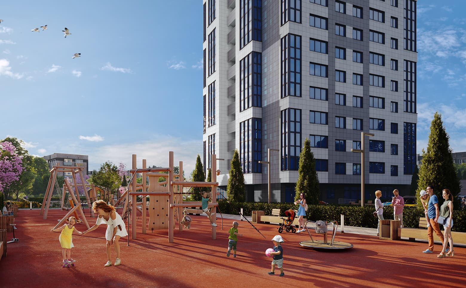 На закрытой территории комплекса создано функциональное пространство для отдыха и спорта: лаунж-зоны с гамаками, место для занятий йогой, воркаут-зона и детская площадка с инновационным оборудованием. Организовано ландшафтное озеленение с редкими растениями и системой автополива. Предусмотрены кладовые, велопарковка, помещение для консьержа, открытая стоянка и коммерческие блоки на нижнем этаже. Для обеспечения безопасности установлены видеодомофоны с функцией распознавания лиц, а также видеонаблюдение.