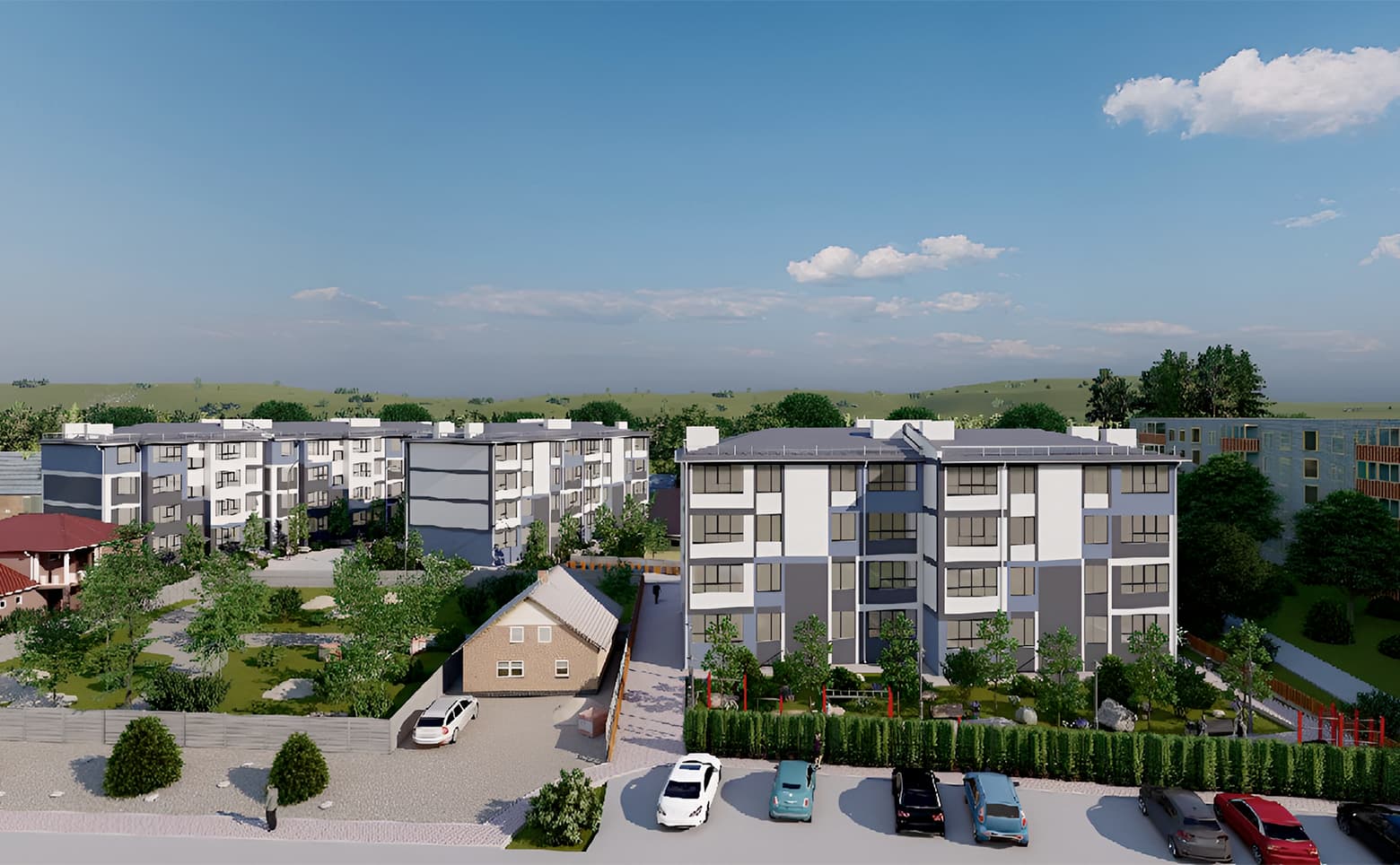 Территория комплекса закрыта от посторонних, обустроены зоны отдыха для детей и взрослых, а также детская и спортивная площадки. Для владельцев авто организована стоянка.