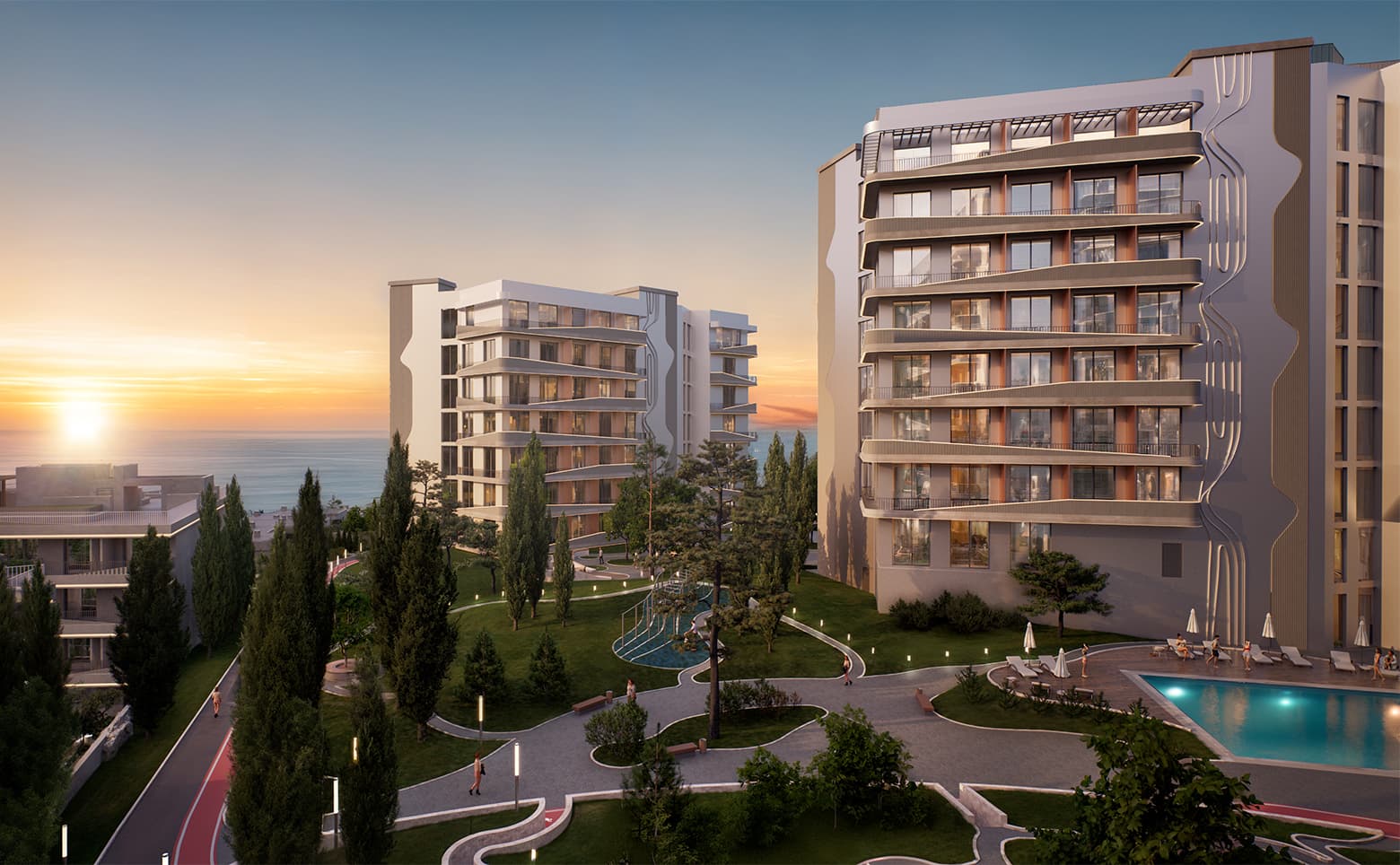 В проекте предлагаются студии и апартаменты с 1–4 комнатами. Установлены панорамные окна с видами на Черное море, горы и виноградные плантации. Высота потолков составляет 2,8 м. Отделка — подчистовая: выполнено возведение перегородок, выровнены стены, сделана бетонная стяжка пола, разводка электрики и отопления, установлены окна и подоконники, проведено водоснабжение и канализация.