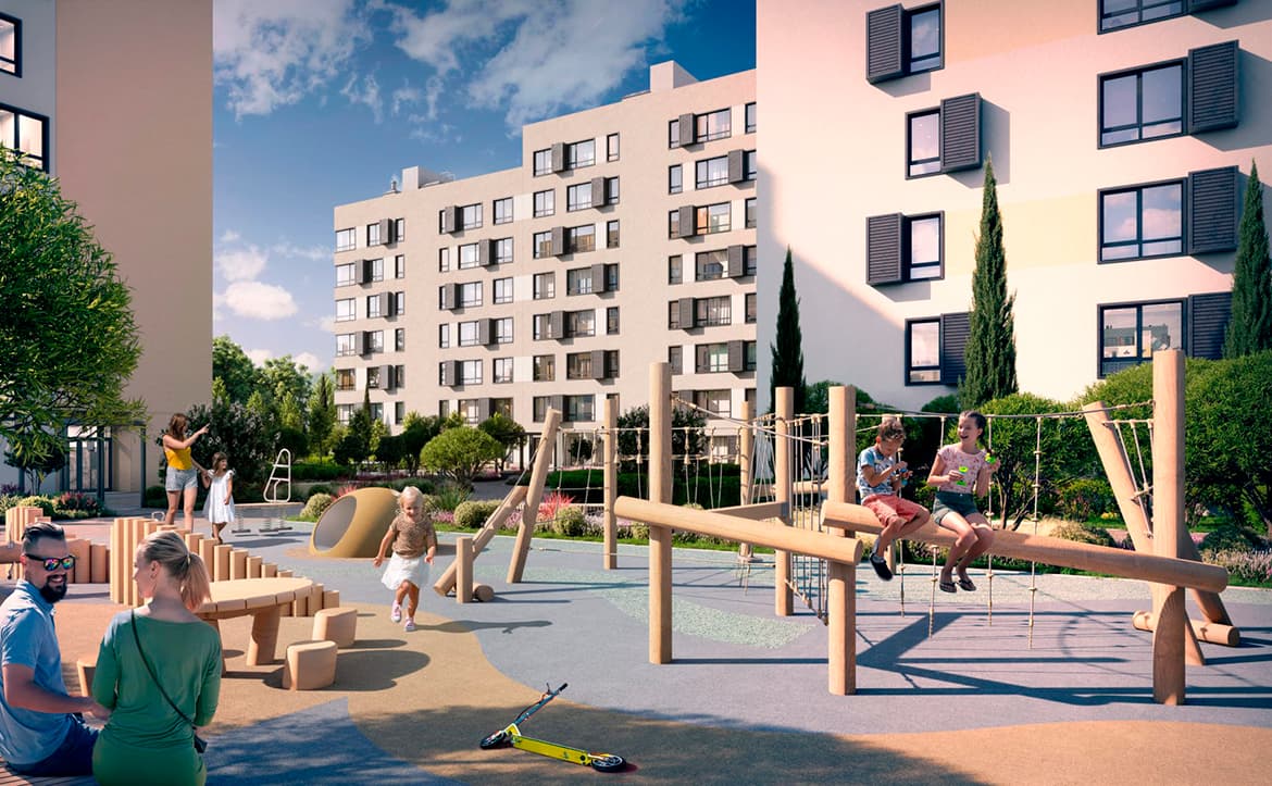 Дворы комплекса организованы как приватное пространство без машин. Территория благоустроена с применением ландшафтного озеленения с системой автополива. Для детей оборудованы игровые площадки, предусмотрены зоны отдыха для всей семьи. Для хранения вещей обустроены кладовые и колясочные. Также доступны удобные парковочные места и собственный торговый центр.