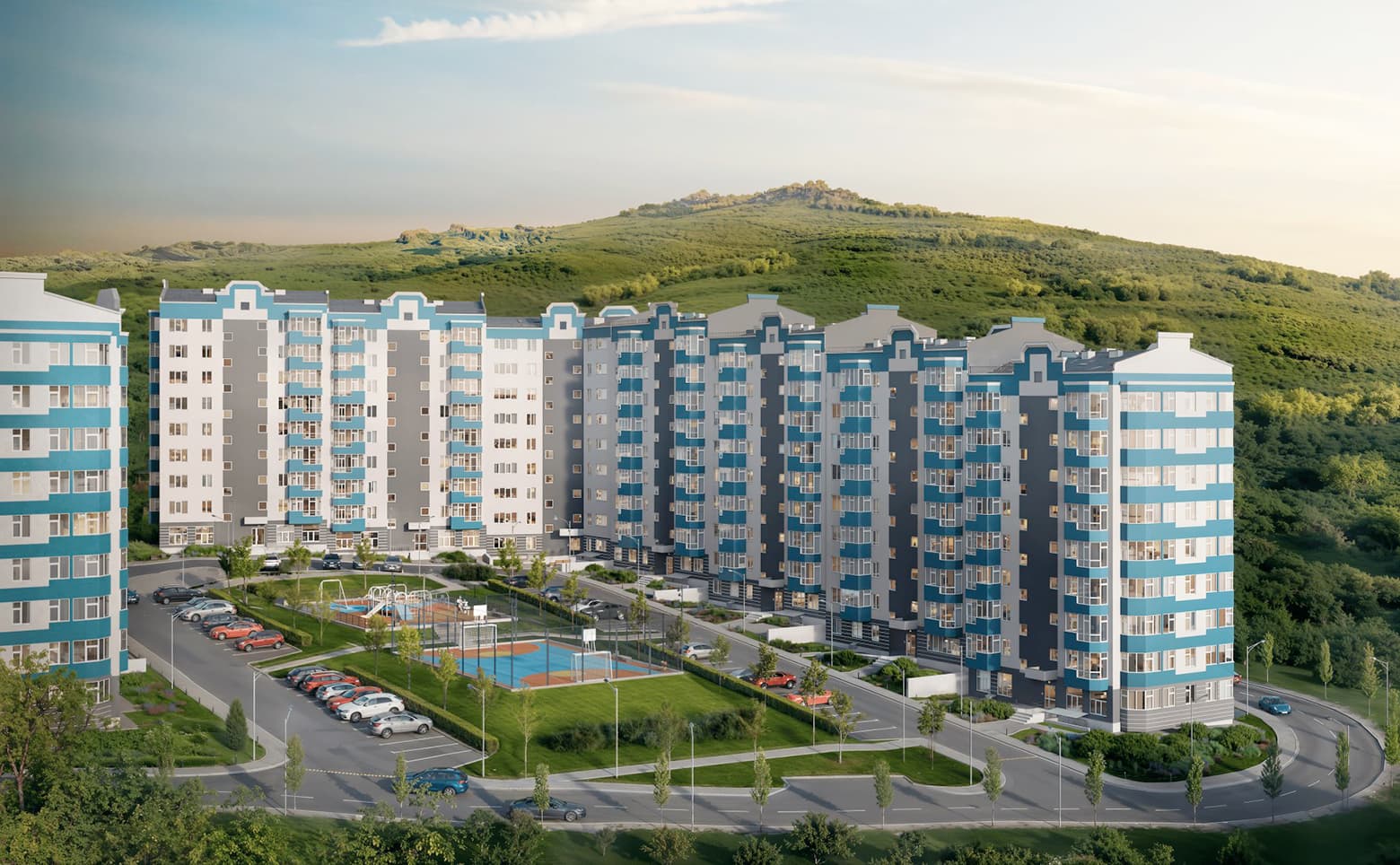 Территория комплекса благоустроена: организованы зоны отдыха, выполнено ландшафтное озеленение, оборудованы детские и спортивные площадки. На первом этаже одной из секций размещены коммерческие помещения. Для владельцев автомобилей предусмотрена наземная стоянка.
