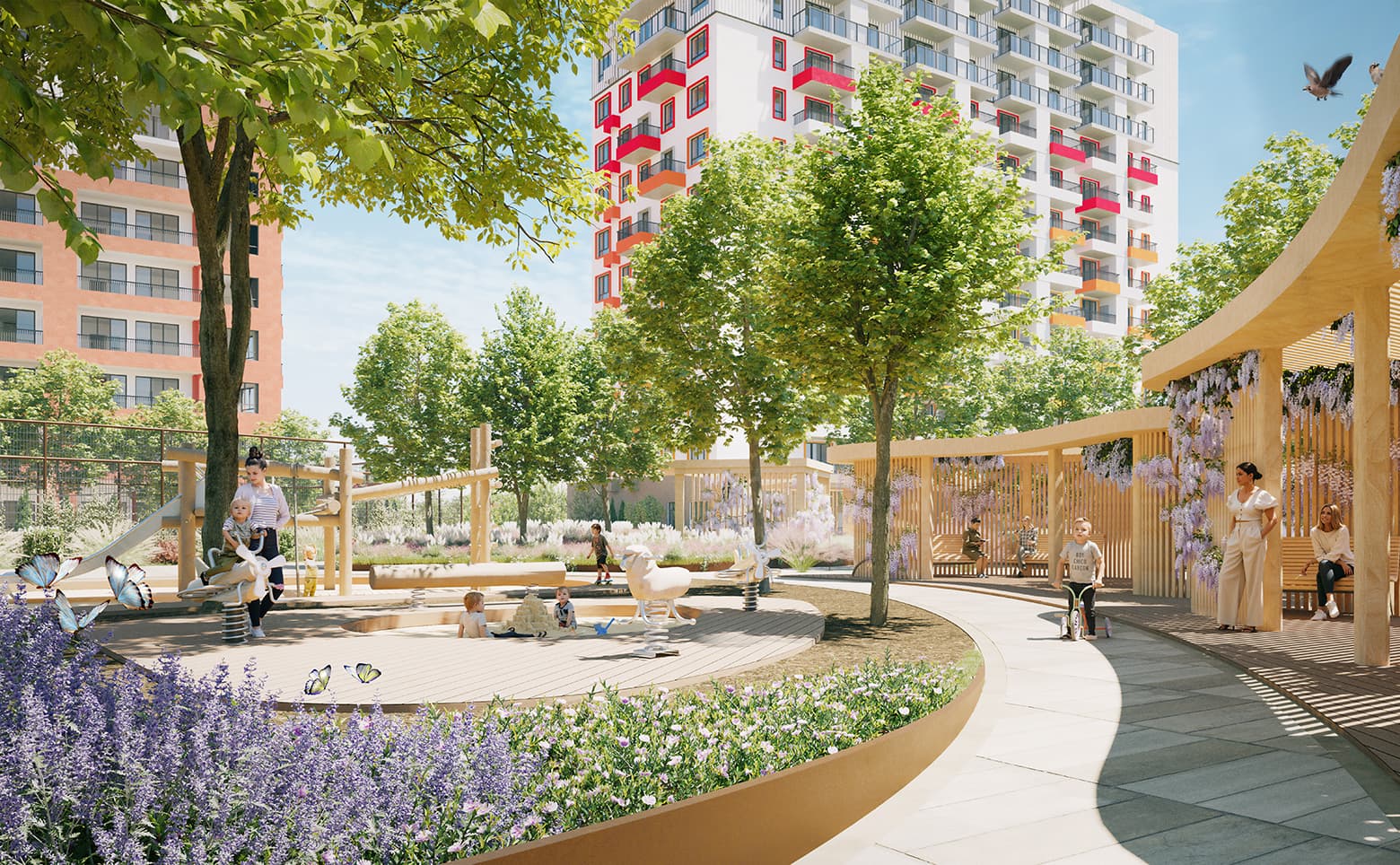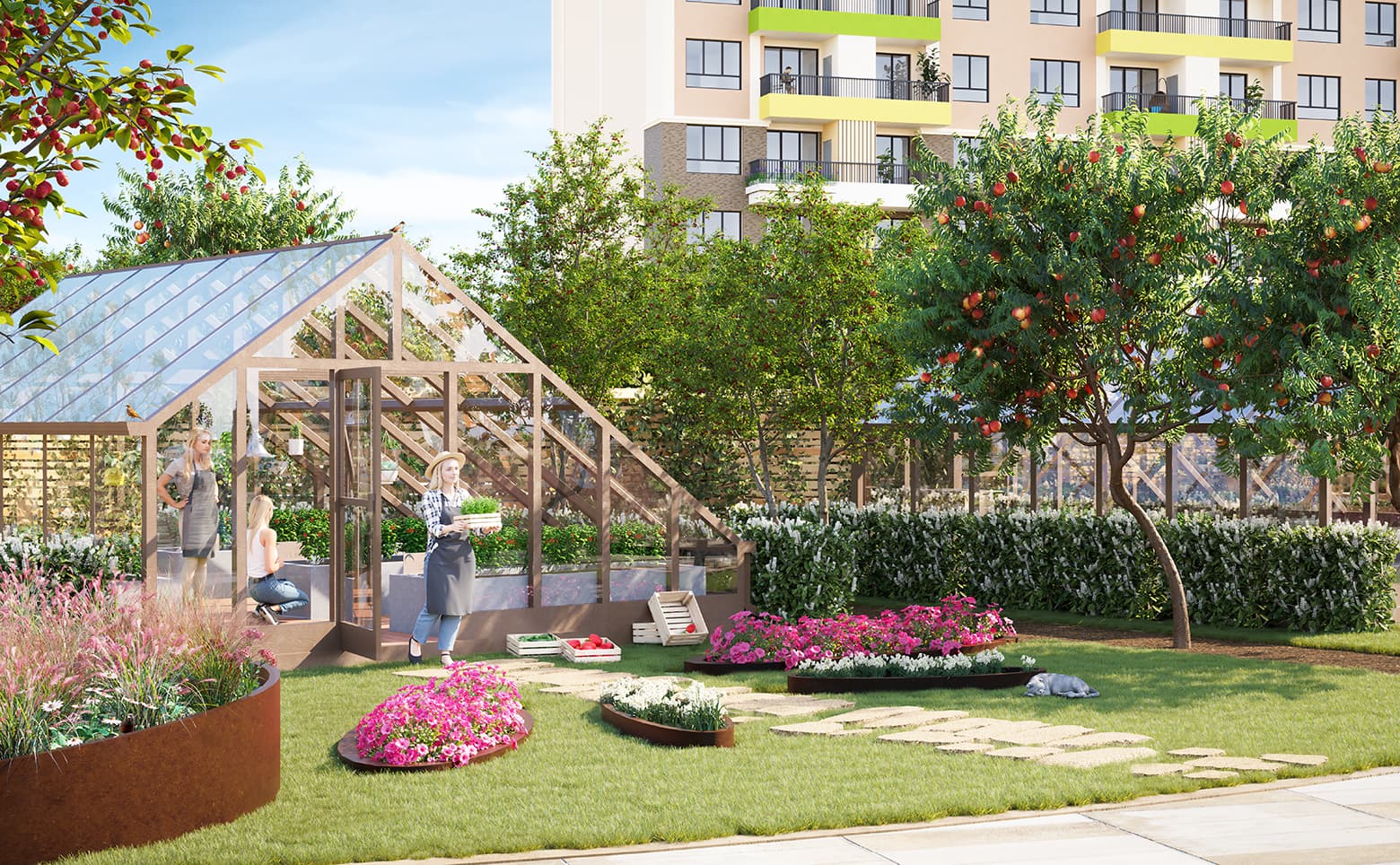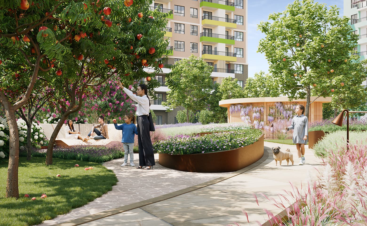Территория комплекса закрыта и находится под видеонаблюдением, организован контроль доступа. Для жителей созданы спортивные и детские площадки, беседки с мангальными зонами, фруктовые деревья, клумбы с пряными травами и уютные пространства тишины с гамаками и качелями. На первых этажах запланированы коммерческие помещения, предусмотрены кладовые и стоянка для авто. Оборудована площадь событий с турнирной зоной и столами для настольных игр.