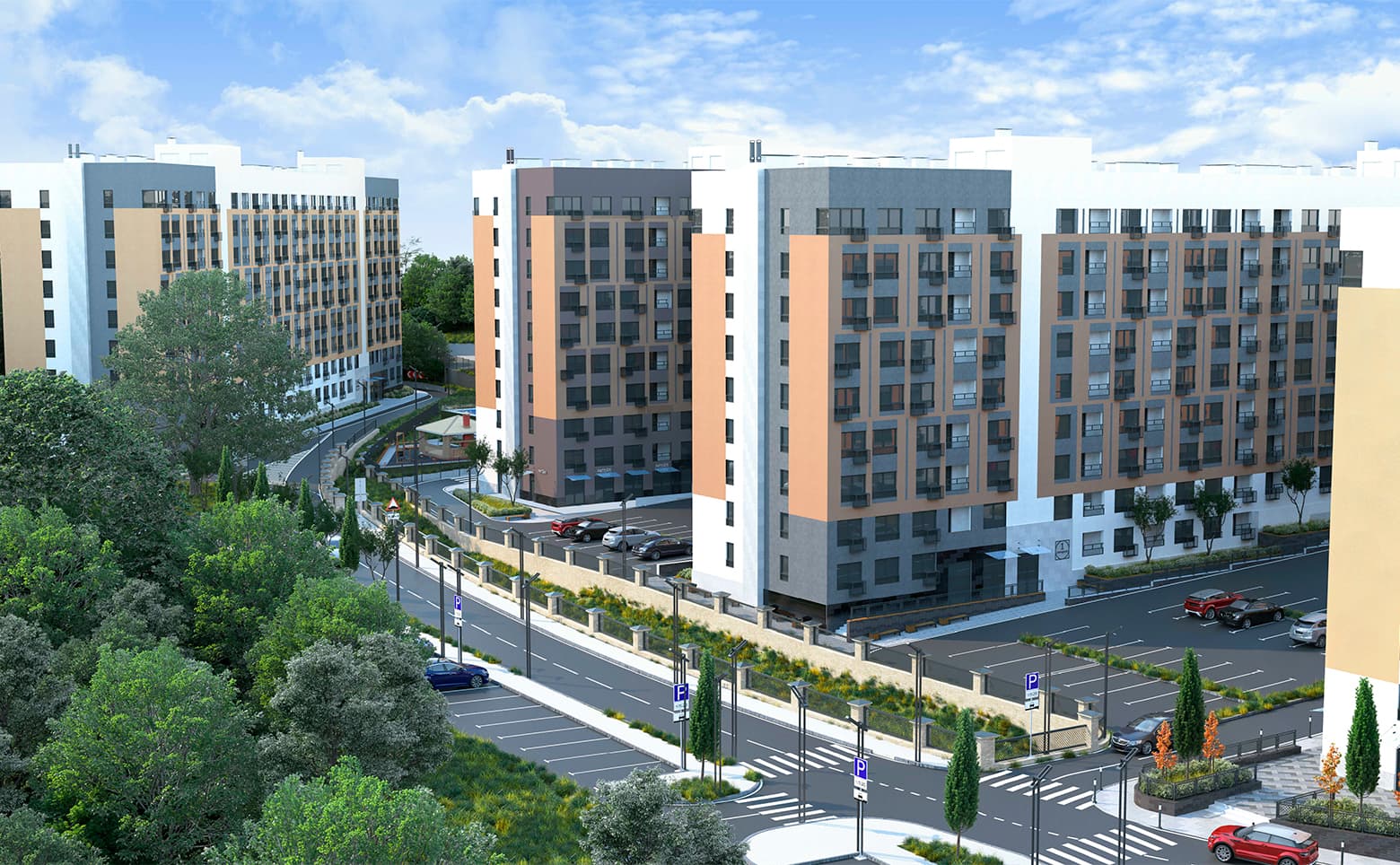 Территория комплекса благоустроена и озеленена, оборудованы детские и спортивные площадки. Для автомобилистов вокруг домов организованы автостоянки и парковочные пространства. В составе комплекса запроектирован детский сад. Предусмотрены офисные и административные помещения для ведения бизнеса.