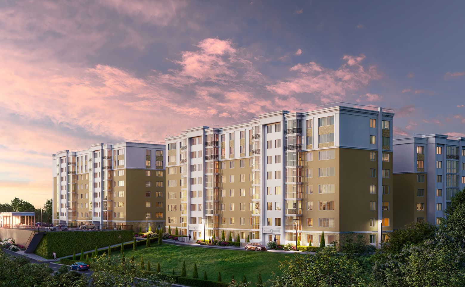 Жилой комплекс комфорт-класса находится на возвышенности и состоит из 4 корпусов высотой 9 этажей. Здания выполнены по монолитной технологии с оштукатуренными фасадами. В каждом д…