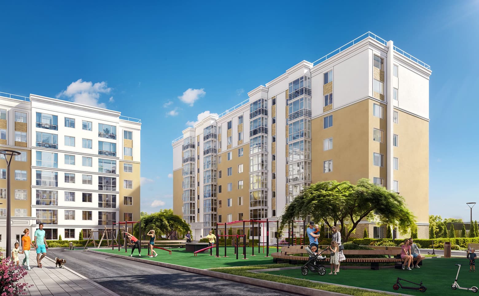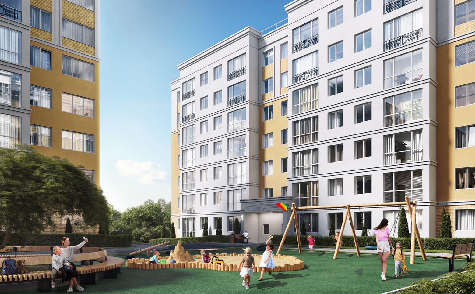 Территория комплекса благоустроена и озеленена, установлен автополив. Для жителей обустроены зоны отдыха, прогулочные маршруты, детские и спортивные площадки, владельцам авто доступна открытая стоянка. Предусмотрены камеры видеонаблюдения по периметру, доступ к подъездам организован по смарт-картам. На нижних этажах размещены коммерческие блоки под магазины, кофейни и сервисные службы.