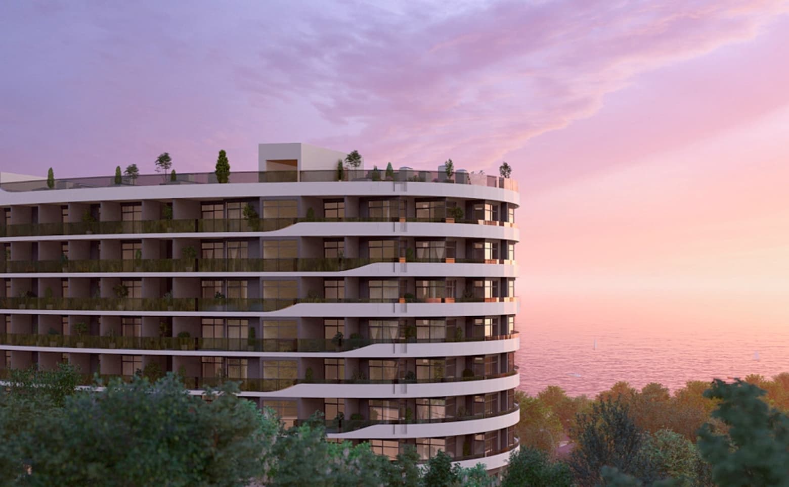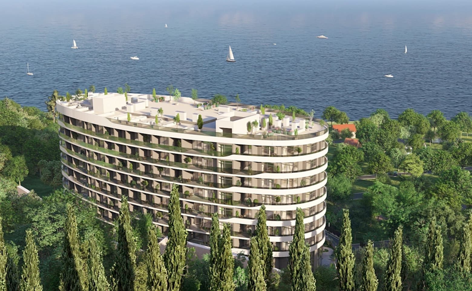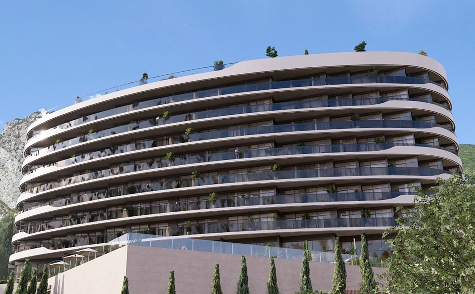 Территория комплекса оформлена с использованием ландшафтного дизайна и высадкой различных видов деревьев и кустарников. Жителям доступны смотровая площадка и видовая терраса на крыше, 2 бассейна с морской водой, акватермальный комплекс, фитнес-центр, рестораны, кафе, конференц-залы, а также подземный паркинг с зарядными точками для электромобилей. Владельцы имеют гарантированный доход от сдачи апартаментов.