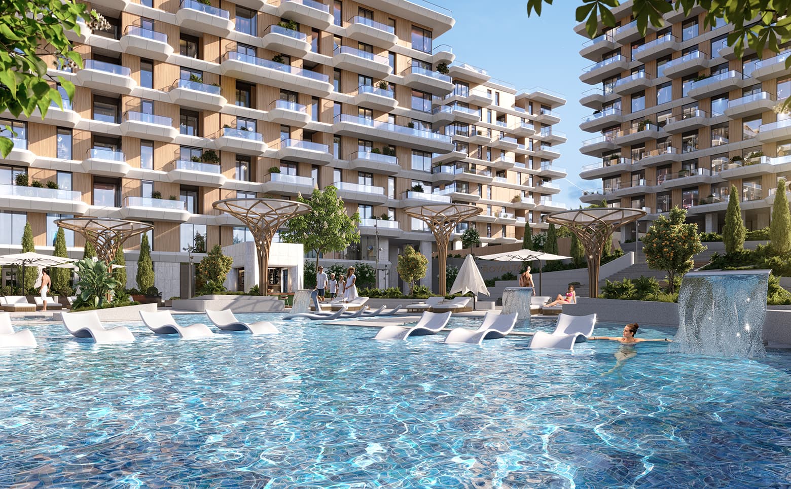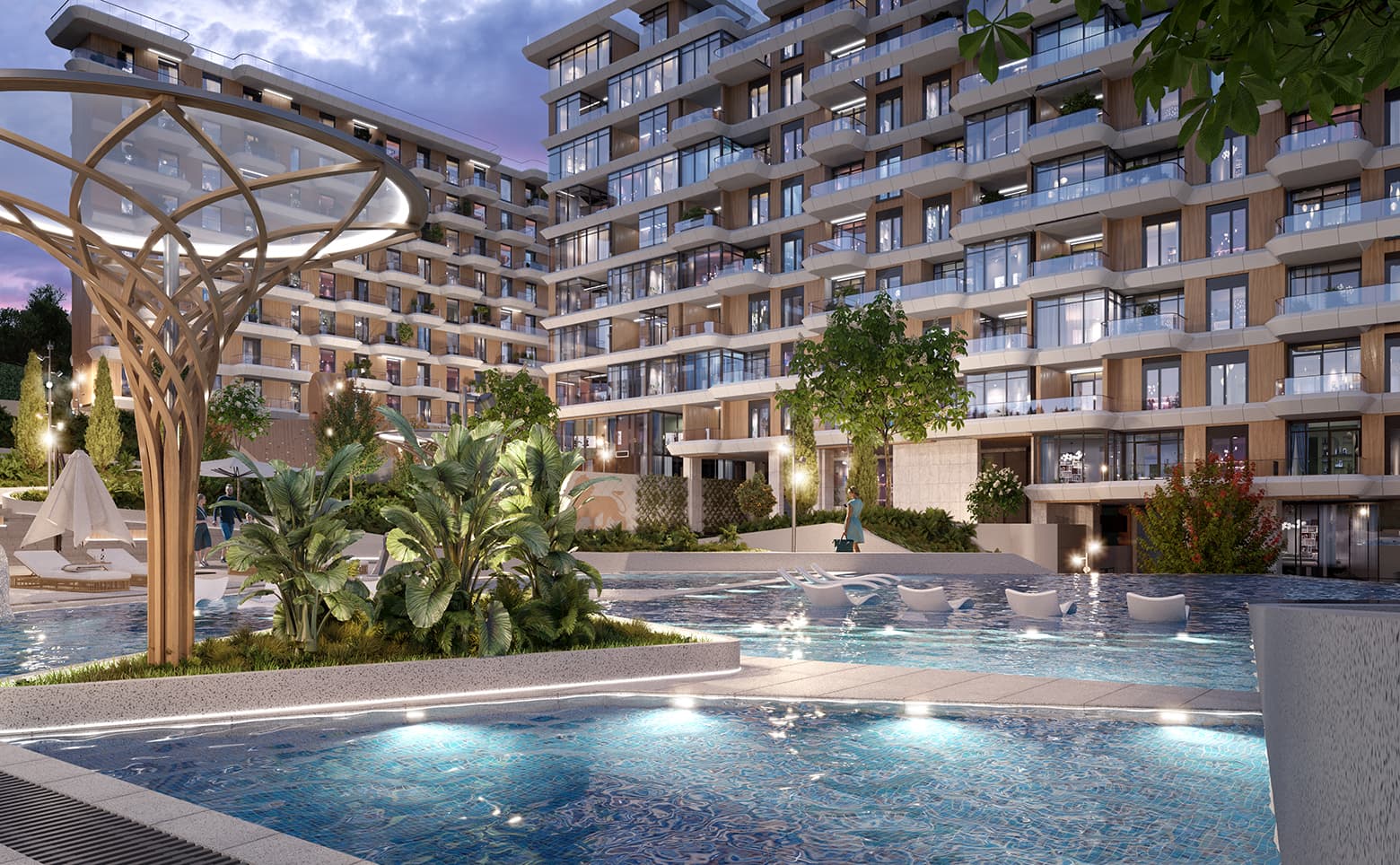 Комплекс спроектирован в формате закрытого клуба с высоким уровнем уединения — территория закрыта и охраняется, установлено круглосуточное видеонаблюдение. Пространство оснащено многоуровневыми террасами, которые спускаются каскадом по направлению к набережной. Локации для активного и спокойного отдыха разделены лестницами-амфитеатрами. Обустроены воркаут-зона, игровые площадки, панорамный инфинити-бассейн, а также спа и фитнес-центры. Вдоль центральной аллеи высажены краснокнижные растения. Жителям доступны рестораны, торговая галерея и стоянка для авто.