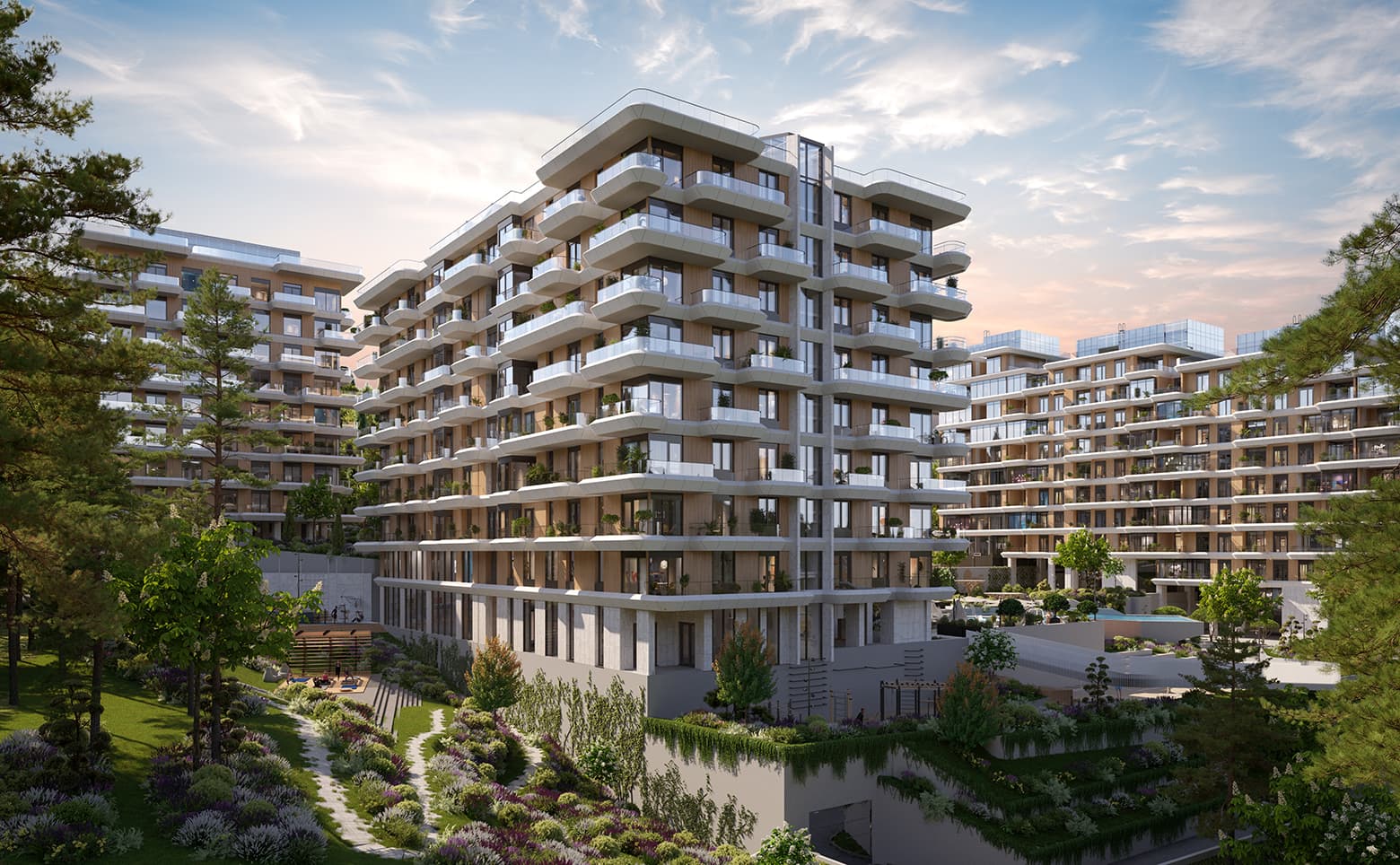 Комплекс апартаментов состоит из 5 корпусов высотой до 9 этажей, выполненных по монолитной технологии. Вентилируемые фасады облицованы панелями, предусмотрены пассажирские и грузо…